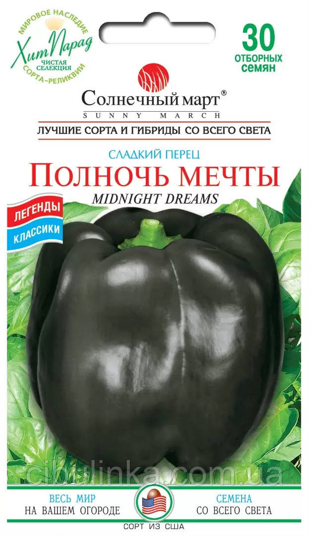 Перець солодкий Опівніч мрії - великі, красиві, блискучі та блискучі, як дорогоцінний камінь, чорні дзвони з ультра-солодким фруктовим смаком. Стінки плодів розміром 10x10 см і вагою 200-220 г. товсті та соковиті, з хрусткою текстурою. Рослина компактна (від 45 до 55 см заввишки) з відмінним листовим покриттям, щоб захистити плоди від сонячних опіків. Сильні товсті стебла надійно витримують високі врожаї. Середньоранній сорт. Почніть збирання цих красивих перців через 75 днів після висадки розсади. Дає велику кількість першосортних чорних дзвонів, які є чудовими як для створення кулінарних шедеврів, так і для їх прикраси.