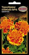 Чорнобривці Іспанська парча - однорічна рослина. Кущі заввишки 30-40 см, з бічними пагонами. Суцвіття – махрові кошики, діаметром 5-8 см, на міцних квітконосах яскраво-червоно-жовтого кольору, рясно та тривало цвіте. Вирощується висівом насіння у відкритий ґрунт у травні-червні або для більш раннього цвітіння на розсаду у квітні. Цвіте із червня до заморозків. Використовують для створення яскравих груп на клумбах, робітках, квітниках, балконних ящиках, вазонах.